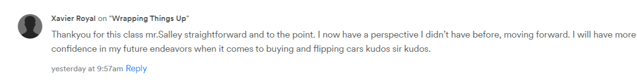 Exclusive access to a private community only accessible by CarShark 101 students. Where we will be helping, challenging, and motivating each other for great car deals!